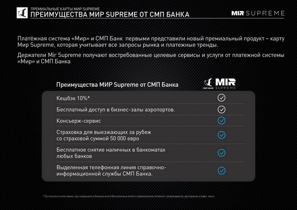 Карта Суприм Привилегия ВТБ МИР сочетает в себе преимущества премиального банковского обслуживания с возможностями национальной платежной системы. Она подойдет состоятельным клиентам, которые активно пользуются кредитными средствами и ценят дополнительные привилегии.
